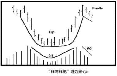 杯柄形是一种持续上升的形态,它跟随上通道的突围而形成一段整理的时间。杯柄形态可分为两部份:杯及杯柄。当某时段价格上涨,一个杯形随之而形成,它的外观好像一个碗或者圆底,亦像是一个呈U字的形态。因为与V形相比,U形比较平坦,故此杯形可以确定是一种在底部具有强烈支持的整理形态。 当杯形形成后,短期的成交,便是杯柄的进化期。由杯柄范围随后突围,并提供一个较强烈的上升趋势讯号。通常杯柄的回调越短暂,越形成上升趋势及加强突围。当突围出现时,成交量明显是上升的。 以上为例,在遇到A点的阻力位前,价格正在上升。不到六个月,杯的形态已形成,而且相遇阻力位B点。价格随后徘徊在同一个交易价格约一个月,然后穿破阻力位,确认了杯柄形。成交量也提供了一个委明确的指标,确认这图形的准确性。因成交量在破位前后增加,代表出现大量买家。