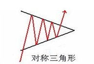 对称三角形(Symmetrical Triangle)又称为等边三角形,一般情形之下,对称三角形是属于整理形态,即价格会继续原来的趋势移动。它是由一系列的价格变动所组成,其变动幅度逐渐缩小,亦即每次变动的最高价,低于前次的水准,而最低价比前次最低价水准高,呈一压缩图形。如从横的方向看价格变动领域,其上限为向下斜线,下限为向上倾线,把短期高点和低点,分别以直线连接起来,就可以形成一对称的三角形。 对称三角形成交量,因愈来愈小幅度的价格变动而递减,正反映出多空力量对后市犹疑不决的观望态度,然后当价格突然跳出三角形时,成交量随之而变大。 若价格往上冲破阻力线(必须得到大成交量的配合),便是一个短期买入讯号;反之,若价格往下跌破(在低成交量之下跌破),便是一个短期沽出讯号。 上图为例,下降趋势出现当价格从A点流入对称三角形及交易徘徊在这个区域。趋势线亦在随后两个月出现(A点至C点和B点至D点)。在E点,价位开始穿破阻力线,尝试转势,但不成功,却成为一个假突破。这是一个很好的例子,可提醒投资者必须等待收市后的讯号,及并留意破位是否准确或是否一个好的入市位。在E 点,价格在趋势线下开市,确认先前的讯号是假的。随后,价格穿破三角形的下点及大量沽盘,这确认了对称三角形的下跌趋势持续。