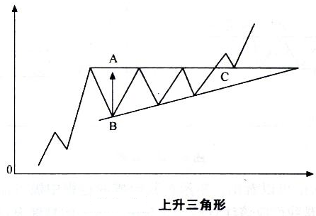 上升三角形(Ascending Triangle)通常在回升高点的连线趋近于水平而回档连线的低点,逐步垫高,因而形成往上倾的上升斜线,而在整理形态的末端,伴随着攻击量能的扩增,一般往上突破的机会较大。 价格在某水平呈现强大的卖压,价格从低点回升到水平便告回落,但市场的购买力仍十分强,价格未回至上次低点便即时反弹,持续使价格随着阻力线的波动而日渐收窄。我们若把每一个短期波动高点连接起来,便可画出一条阻力线;而每一个短期波动低点则可相连出另一条向上倾斜的线,便形成上升三角形。成交量在形态形成的过程中不断减少。 上升三角形显示买卖双方在该范围内的较量,但买方的力量在争持中已稍占上风。卖方在其特定的价格水平不断沽售,不急于出货,但却不看好后市,于是价格每升到理想的沽售水平便即沽出,这样在同一价格的沽售形成了一条水平的供给线。不过,市场的购买力量很强,他们不待价格回落到上次的低点,更急不及待地购进,因此形成一条向右上方倾斜的需求线。 上图为例,上升三角形在最初形成时,价格亦开始向上升。整个形态发生在三个月内,但并没有穿破B、C及E的阻力线。而较高的低位A点至D点至F点,代表正在积聚及市况会继续上升。在整个过程中,成交量比预期弱,但在F点开始赶上。而价格刚好受制于支持线,然后反弹升穿阻力位G点,而且G点的成交量很高。上升三角形形态确认后,市势将会持续上升。
